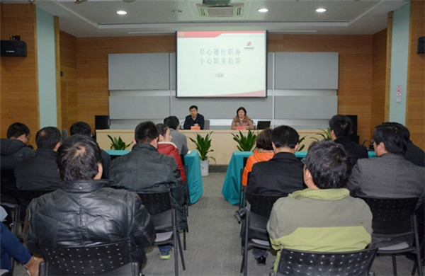 12月26日,開(kāi)發(fā)公司邀請(qǐng)宿城區(qū)檢察院預(yù)防職務(wù)犯罪科科長(zhǎng)王麗娟作《盡心履行職務(wù),小心職務(wù)犯罪》專題講座,園區(qū)黨工委委員、管委會(huì)副主任、開(kāi)發(fā)公司總裁陸志剛參加講座。