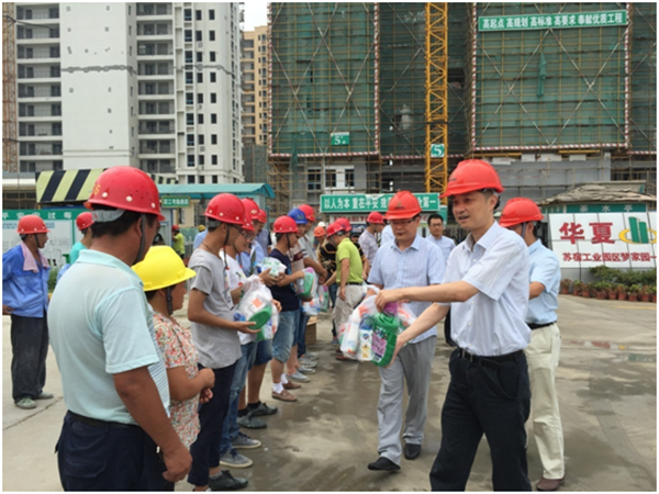 2016年7月27日上午,為切實(shí)做好建筑工地防暑降溫工作,讓施工人員在溫馨的工作環(huán)境中安全作業(yè),園區(qū)黨工委委員、管委會(huì)副主任、規(guī)劃建設(shè)局局長許紹杰、副局長張循在開發(fā)公司副總裁劉建華的陪同下冒著酷暑慰問夢家園工地一線施工人員。