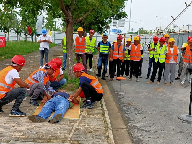 此次演練是模擬工人在戶外作業(yè)時發(fā)生中暑后的現(xiàn)象以及如何進(jìn)行急救的。演練現(xiàn)場,演練示范人員按照應(yīng)急預(yù)案對“中暑”的員工進(jìn)行緊急施救,首先發(fā)現(xiàn)中暑人員后將其迅速轉(zhuǎn)移到陰涼通風(fēng)的地方,移動、冷敷、擦浴、降溫、補(bǔ)水......各項(xiàng)救援措施緊張有序。整個演練過程歷時30多分鐘,中暑人員在急救小組的緊密合作下,及時得到救治。演練過程中,市政工程部全體人員和各在建工地相關(guān)人員全程參與觀摩。