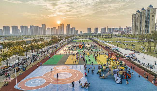 玄武湖西路北側(cè)臨時(shí)健身公園占地面積約2.2萬(wàn)平方米,內(nèi)部設(shè)置720米健身跑道、全齡段健身區(qū)、綜合兒童活動(dòng)區(qū)、平地輪滑場(chǎng)、廣場(chǎng)舞區(qū)及各類球場(chǎng)(籠式籃球場(chǎng)4組、7人制籠式足球場(chǎng)1組、羽毛球場(chǎng)4組、網(wǎng)球場(chǎng)一組)等6項(xiàng)主題運(yùn)動(dòng)功能,滿足周邊群眾“一站式”運(yùn)動(dòng)健身需求。場(chǎng)地建成后先后登上人民日?qǐng)?bào)頭版、新華日?qǐng)?bào)、學(xué)習(xí)強(qiáng)國(guó)等國(guó)家主流媒體,園區(qū)充分利用閑置待開(kāi)發(fā)地塊空間,積極構(gòu)建“10分鐘健身圈”,獲得周邊居民的認(rèn)可和喜愛(ài)。