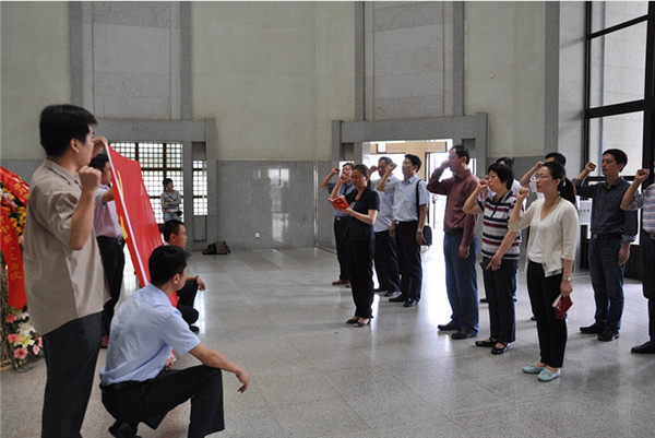 在周恩來(lái)紀(jì)念館總理雕像前,駱敏、周原敬獻(xiàn)了花籃,園區(qū)各局辦、開發(fā)公司黨員負(fù)責(zé)同志面對(duì)鮮紅的黨旗,莊嚴(yán)地舉起右拳齊聲宣誓,重溫了入黨誓詞。