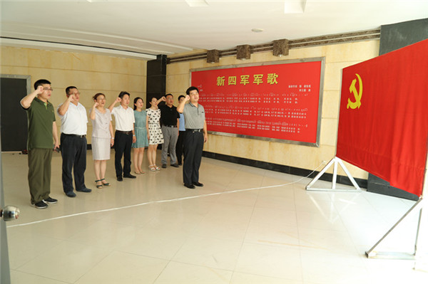 在黃花塘新四軍紀(jì)念館,全體黨員干部觀看了實物展覽和文字圖片介紹,直觀地感受和體會了新四軍革命先烈在硝煙彌漫的年代,用鮮血和生命爭取人民解放的偉大奉獻(xiàn)精神,學(xué)習(xí)了陳毅、粟裕等老一輩無產(chǎn)階級革命家敢為人先、顧全大局、不畏犧牲、艱苦奮斗的優(yōu)良傳統(tǒng)。在紀(jì)念館大廳,全體黨員面對鮮紅的黨旗,莊嚴(yán)地舉起右拳齊聲宣誓,重溫了入黨誓詞。